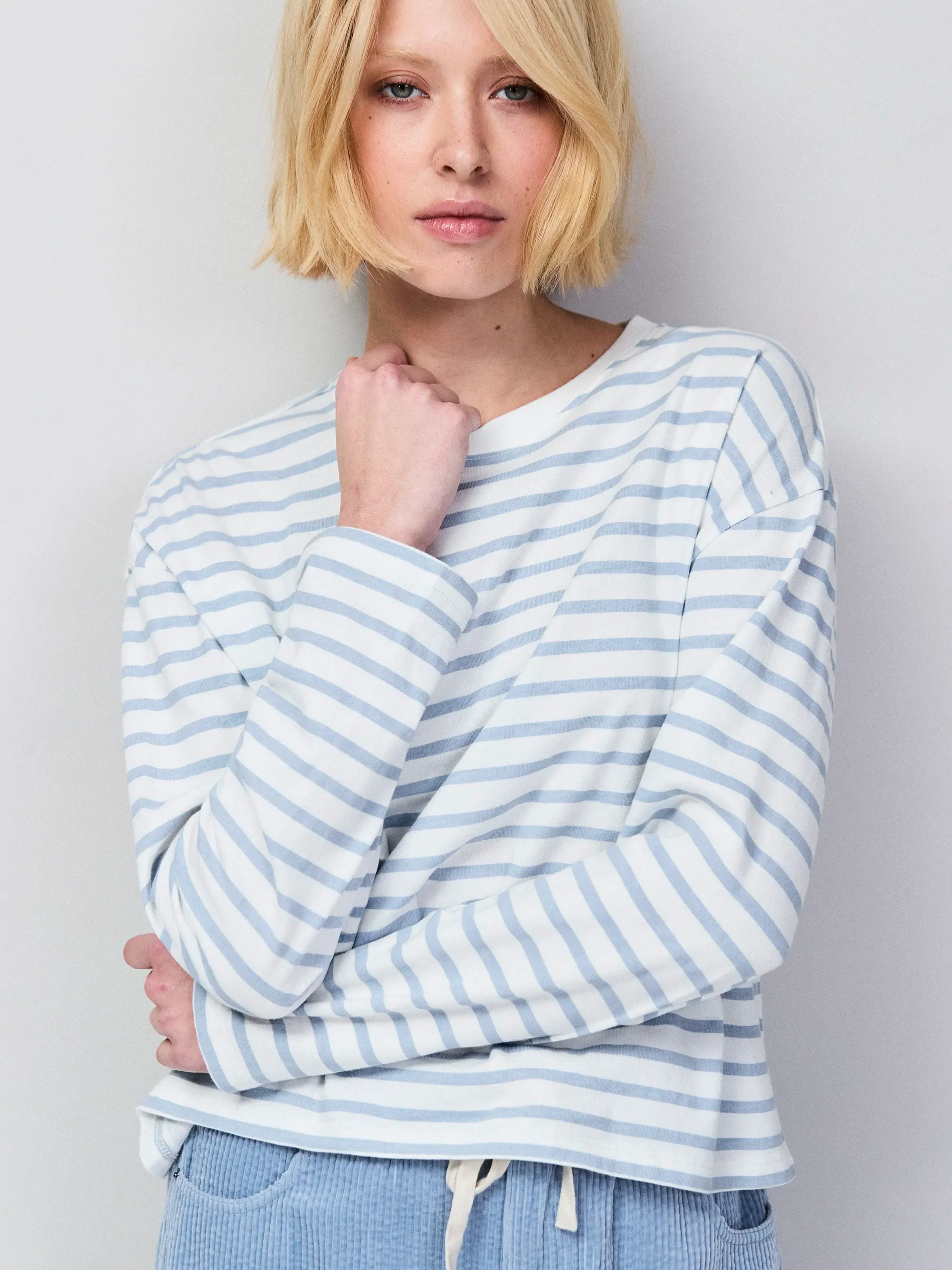 An easy, everyday piece with a clean finish. This blue striped long-sleeved T-shirt is cut from soft organic cotton and shaped with a relaxed fit that falls just right. The classic round neckline and timeless stripe make it endlessly versatile, ideal with denim, tucked into tailoring, or layered under knitwear when the weather cools. Simple, considered, and designed to be worn on repeat.