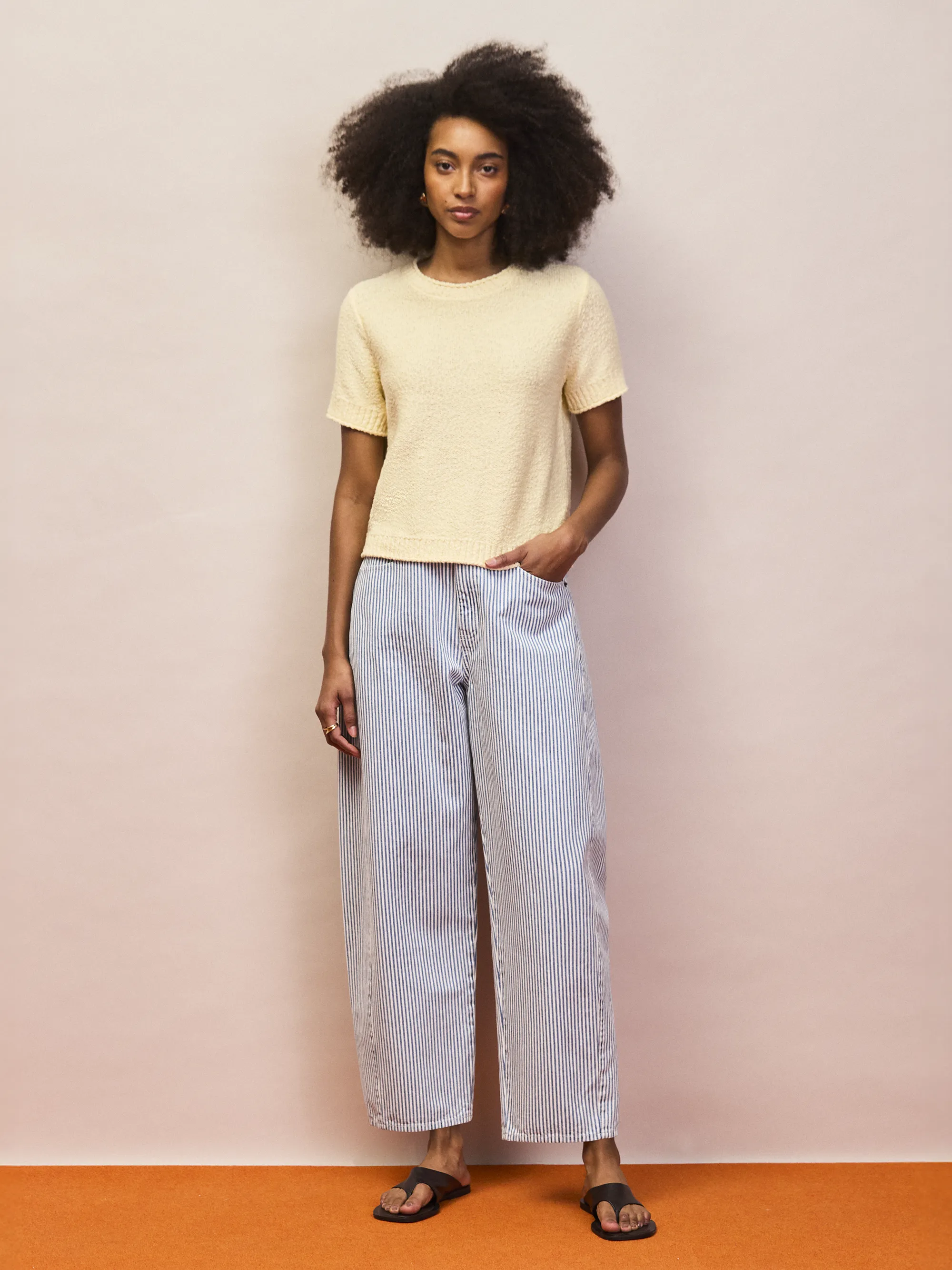 Put a spring in your step with this buttermilk-hued top. It is knitted from cotton-blend yarns for a nubby texture and has a ribbed crew neckline, cuffs and hem. Style it with striped trousers or faded jeans and trainers or ballet flats.